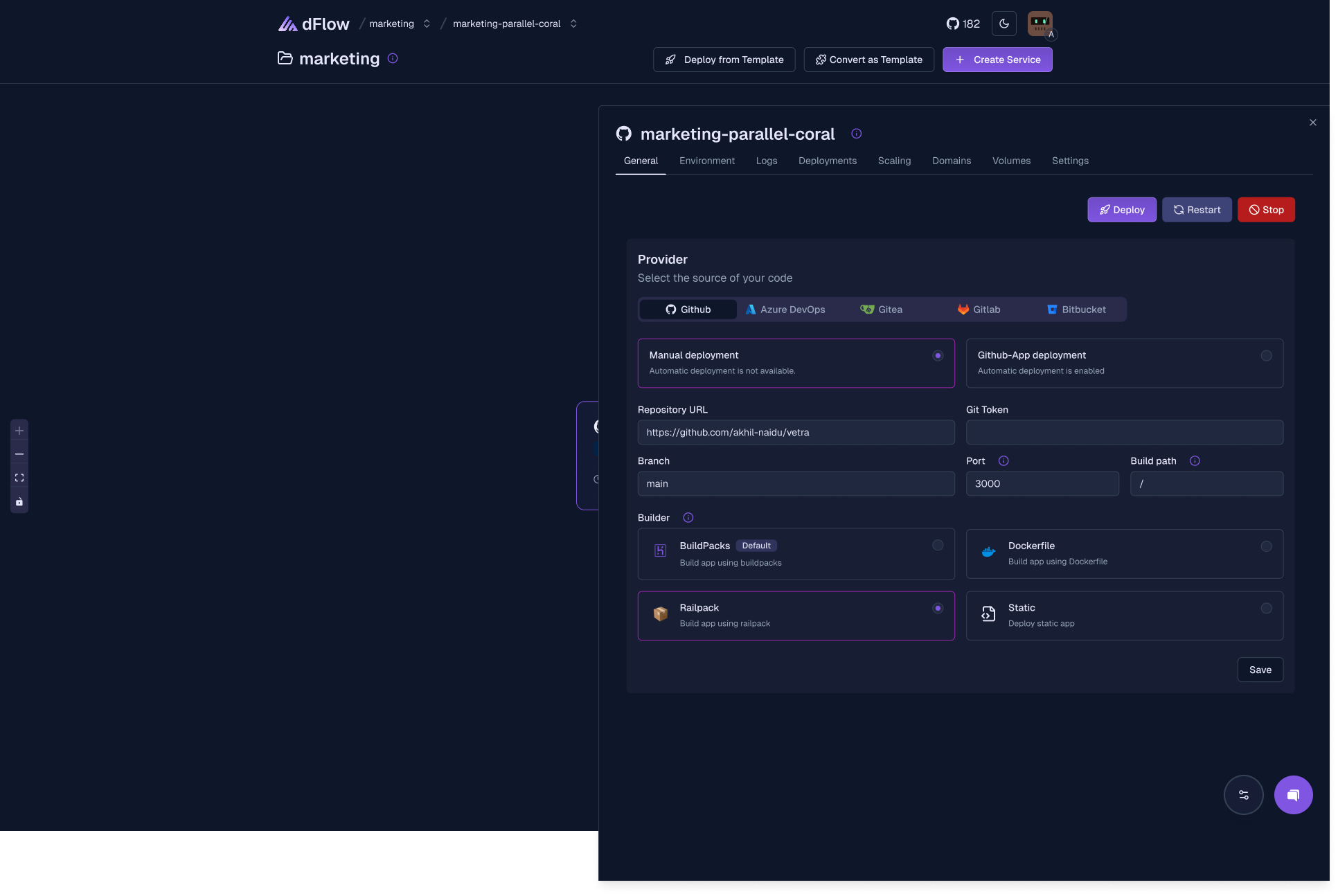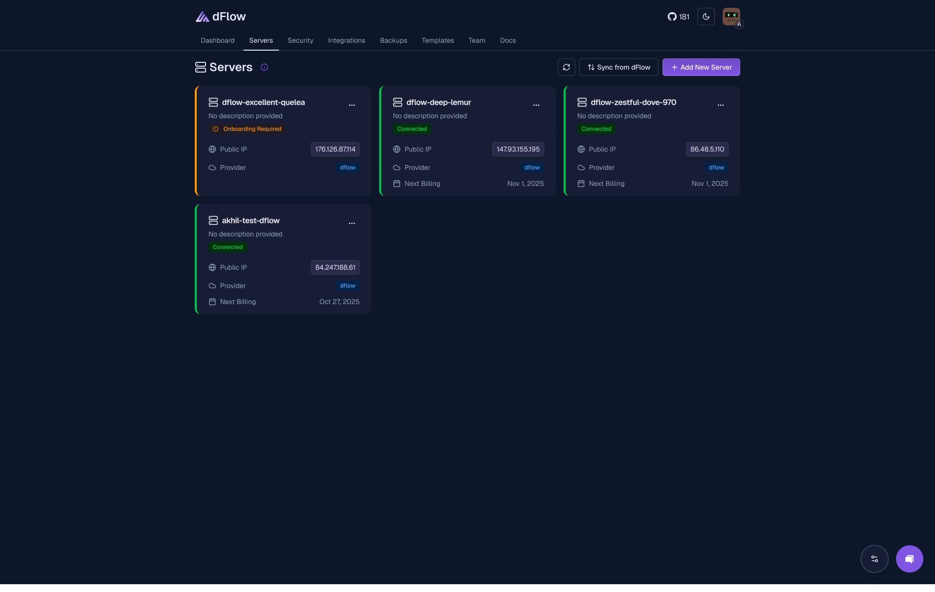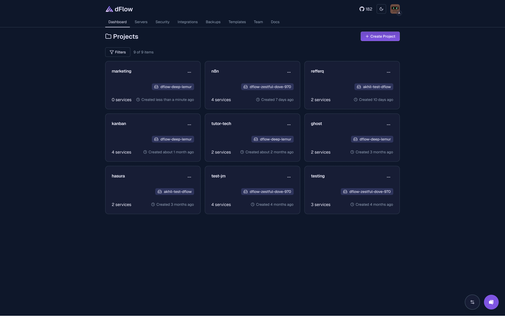 A visual tour of the dFlow platform — including projects, servers, deployments, logs, and settings. Use these screenshots to quickly understand the interface and how different features are organized.